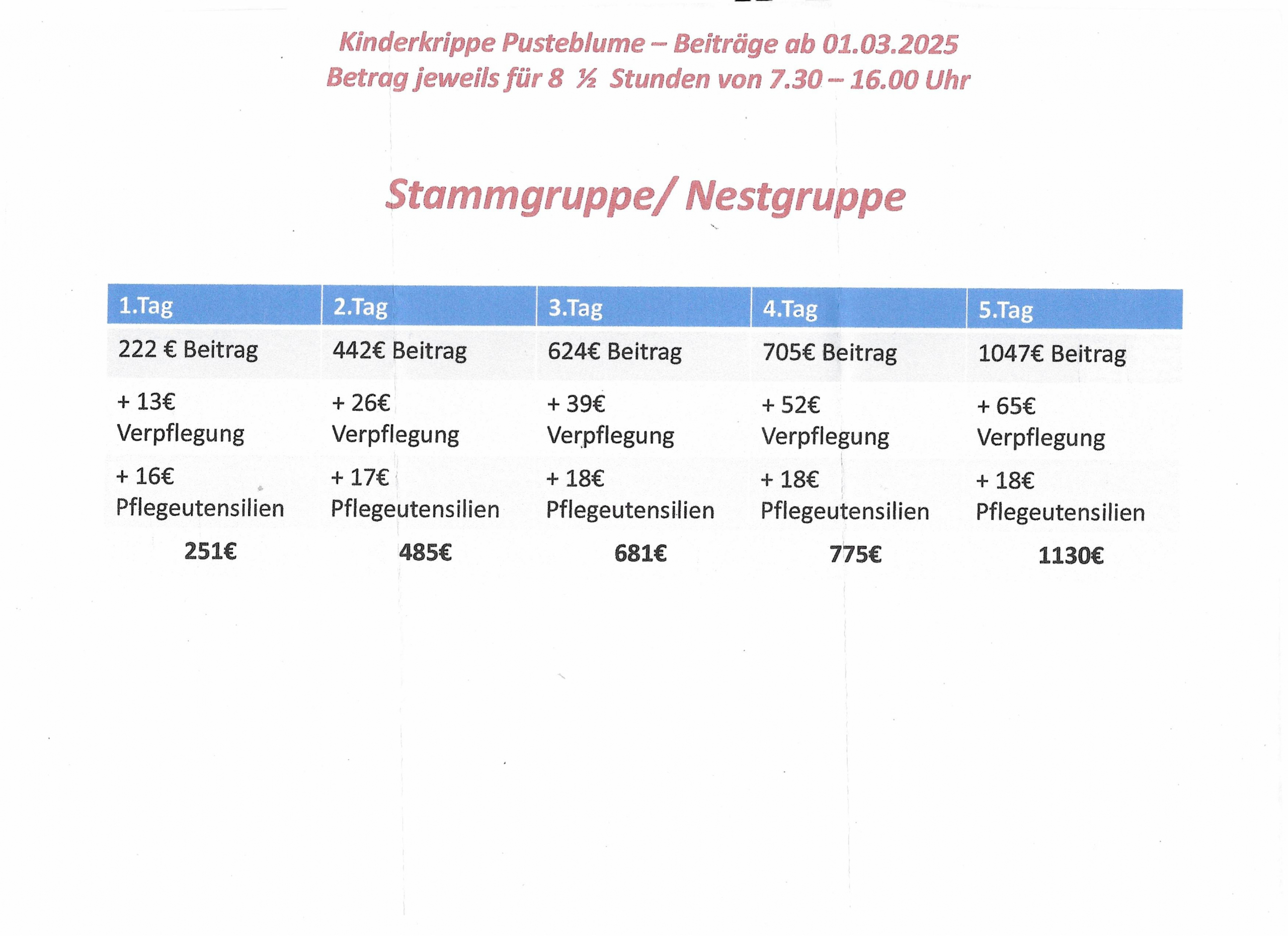 Unsere Betreuungspreise setzen sich aus Beitrag, Verpflegungspauschale und Hygieneprodukte z.B. Windeln zusammen. Beim Beitrag gehen Sie kurz gesagt von ca. 4,50 die Stunde aus! Melden Sie sich bitte für weitere Informationen.